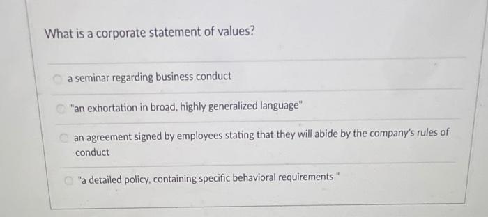 Solved What Is A Corporate Statement Of Values A Seminar Chegg Com